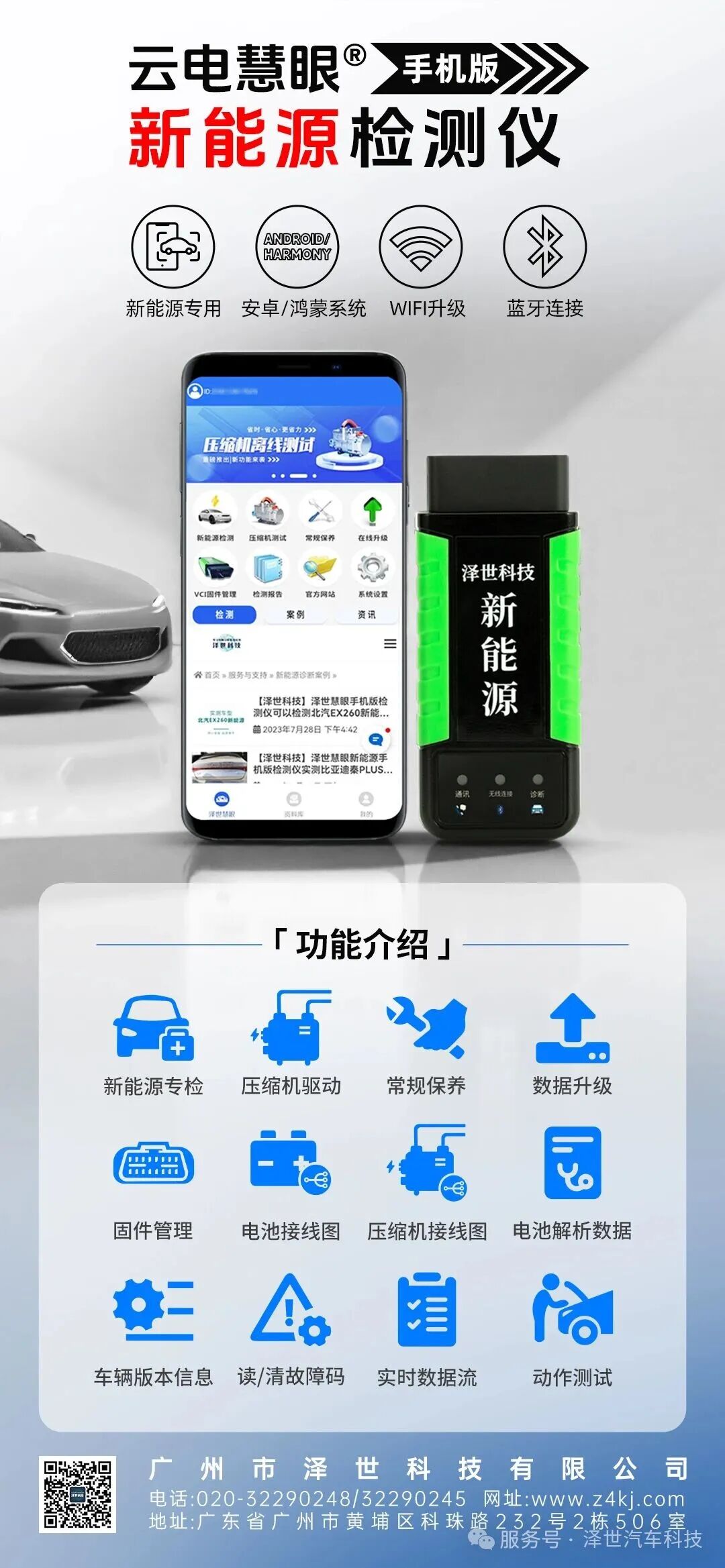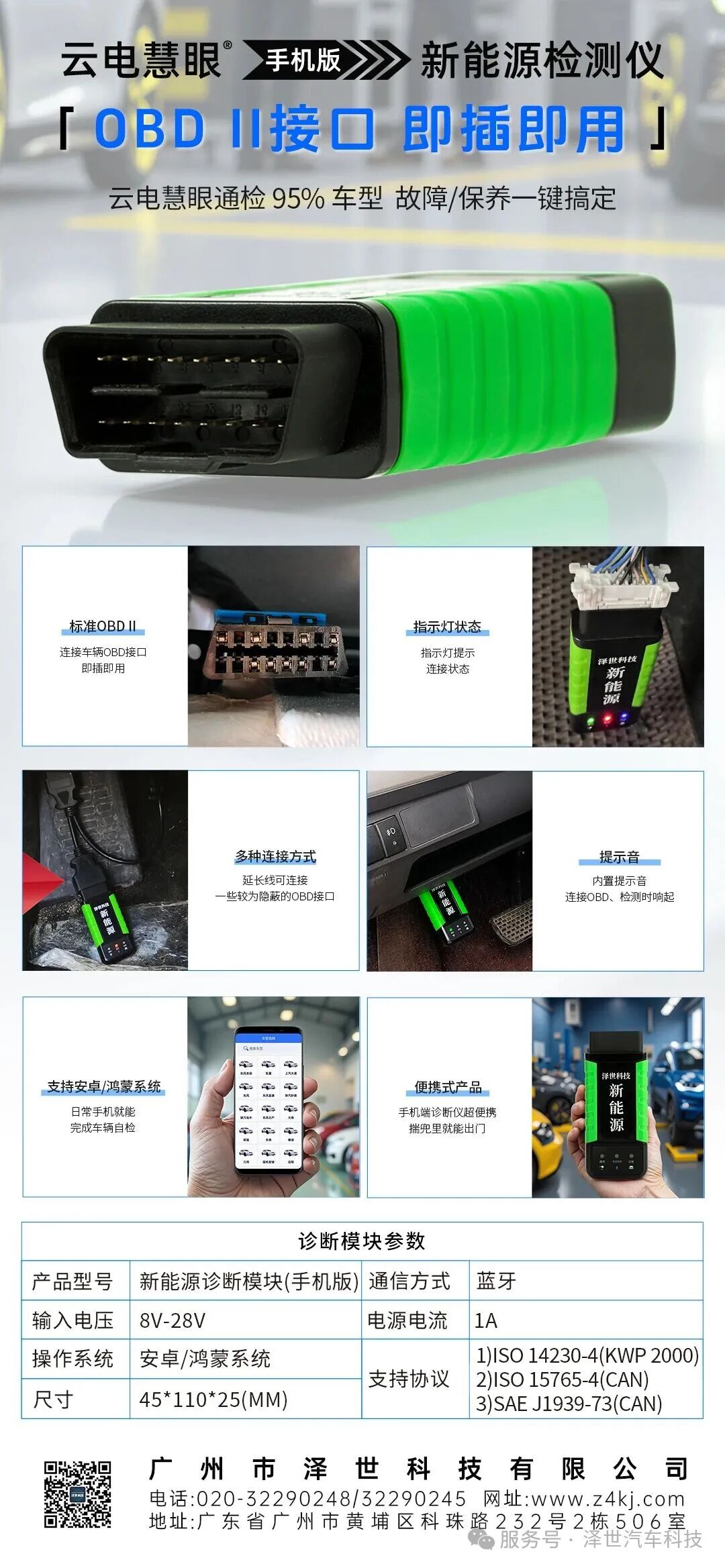 泽世科技新能源汽车手机端专用检测仪,打破传统硬件的束缚,便携式诊断,VCI采用标准的OBD设计,小身材大用处,单手可握,外出救援携带方便。安卓/鸿蒙系统手机都支持,无需购买专用手机。