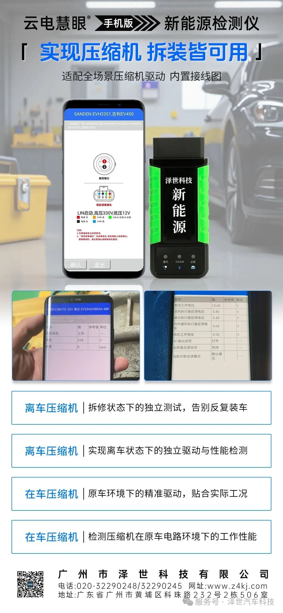 核心优势在于全场景检测能力:电池包检测分配车型高清接线图,标注线路引脚与颜色,可解析单体电压、温度,读电池数据项、SOC、SOH等,支持离车检测,维修效率提80%;压缩机检测支持在车(依托原车供电,模拟工况)与离车(专用转接,独立测试)双驱动,搭配专属接线图,清晰标注端子定义防接错。